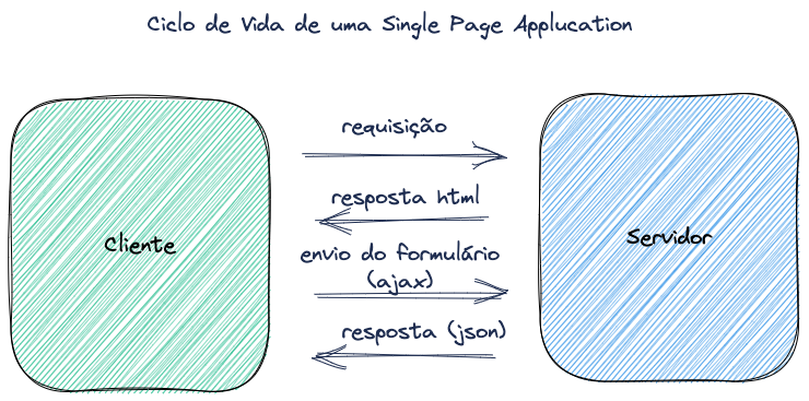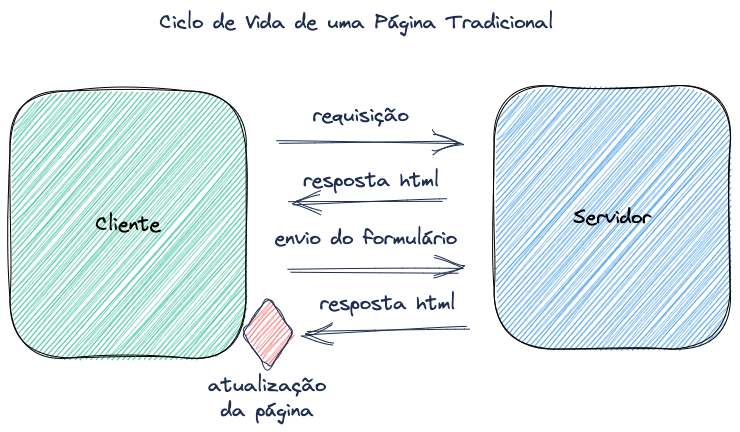 Agora que vimos o conceito de página tradicional, podemos comparar os dois. Na imagem a seguir, mostro o ciclo de vida de uma página tradicional e de um SPA.